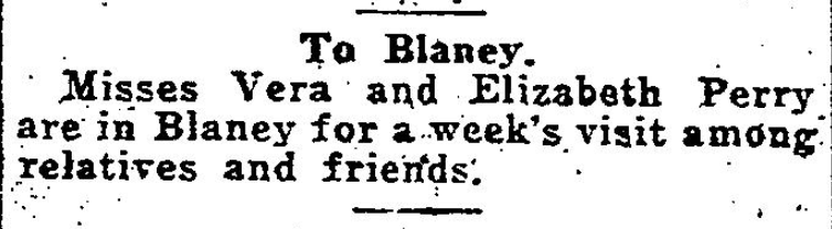 To Blaney Misses Vera Perry and Elizabeth Perry are in Blaney for a week’s visit among relatives and friends. Continue reading Columbia Society, Women’s Club, Philanthropies