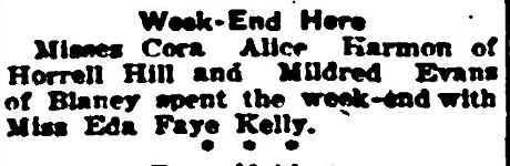 Week-End Here Misses Cora Alice Harmon of Horrell Hill and Mildred Evans of Blaney spent the week-end with Miss Eda Faye Kelly. Continue reading Gossip of Society and Women’s Clubs