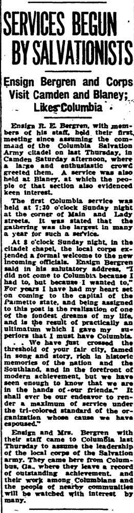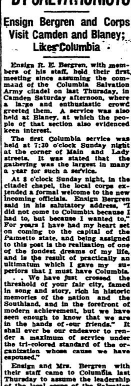 Ensign R. E. Bergren, with member of his staff, held their first meeting since assuming the command of the Columbia Salvation Army citadel on last Thursday, in Camden Saturday afternoon, where a large and enthusiastic crowd greeted them. A service was also held at Blaney, at which the people of that section also evidenced keen interest.