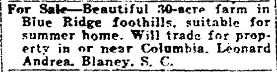 For Sale – Beautiful 30-acre farm in Blue Ridge foothills, suitable for summer home. Will trade for property in or near Columbia. Leonard Andrea. Blaney, S. C.