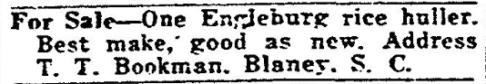 Life Story and ObituaryMACHINERY For Sale – One Engleburg rice huller. Best make, good as new. Address T. T. Bookman, Blaney, S. C. January 23, 1927 State (published as The State) Columbia, South CarolinaPage 28