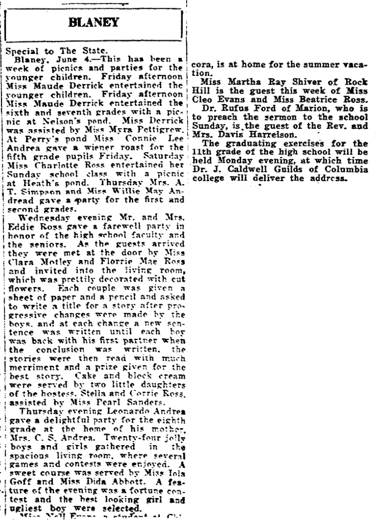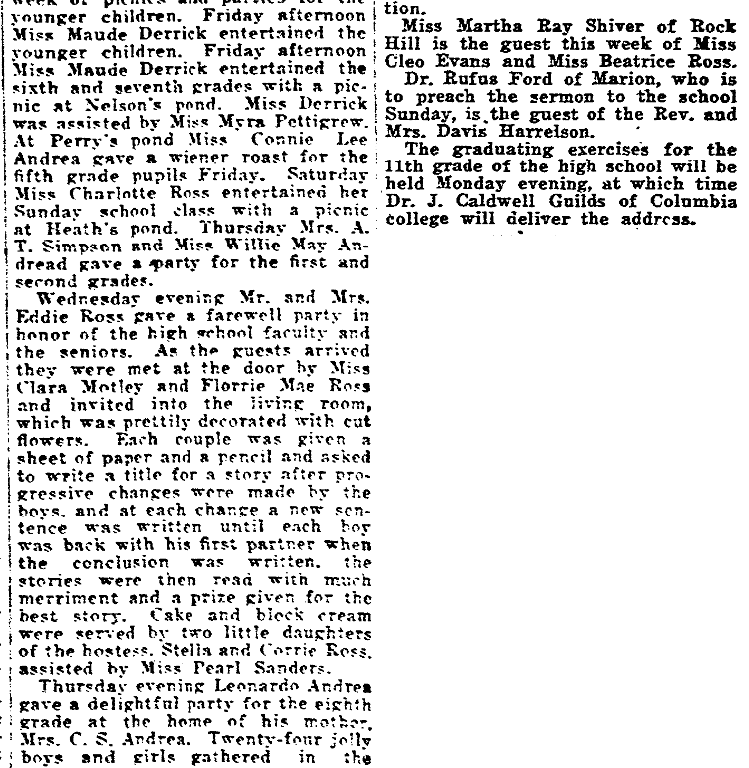 Wednesday evening Mr. and Mrs. Eddie Ross gave a farewell party in honor of the high school faculty and the seniors. As the guest arrived they were met at the door by Miss Clara Motley and Florrie Mae Ross and invited into the living room, which was prettily decorated with cut flowers. Each couple was given a sheet of paper and a pencil and asked to write a title for a story after progressive changes were made by the boys and at each chance a new sentence was written until each boy was back with his first partner when the conclusion was written. The stories were then read with much merriment and a prize given for the best story. Cake and block cream were served by two little daughters of the hostess, Stella Ross and Corrie Ross assisted by Miss Pearl Sanders.