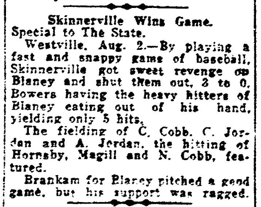 Westville, Aug. 2. – By playing a fast and snappy game of baseball, Skinnerville got sweet revenge on Blaney and shut them out, 3 to 0, Bowers having the heavy hitters of Blaney eating out of his hand, yielding only 5 hits.