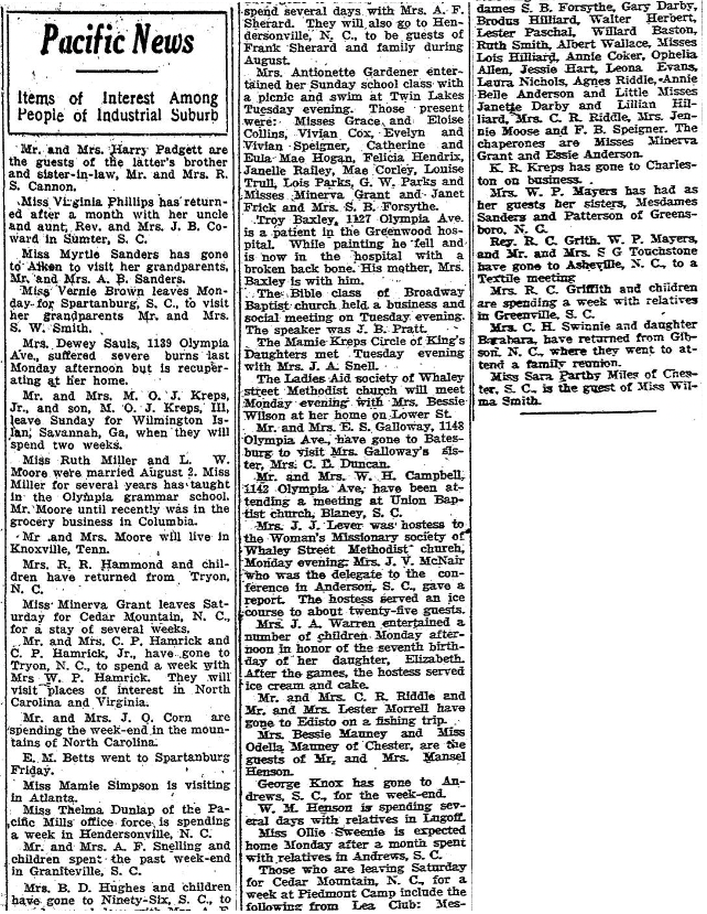 Miss Thelma Dunlap of the Pacific Mills office force is spending a week in Hendersonville, N. C.