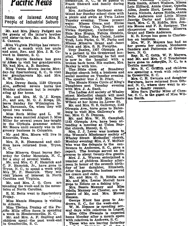 Miss Thelma Dunlap of the Pacific Mills office force is spending a week in Hendersonville, N. C.