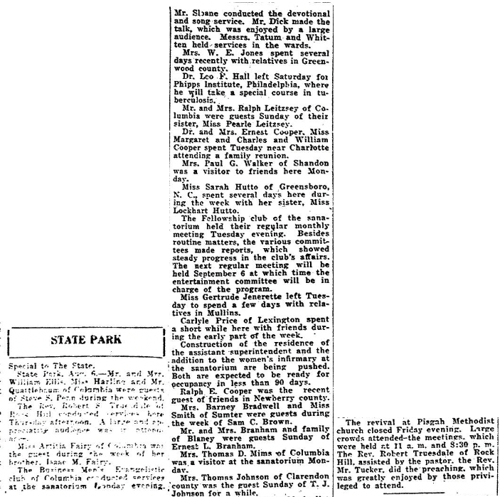 Mrs. Thomas D. Mims of Columbia was a visitor at the sanatorium Monday.