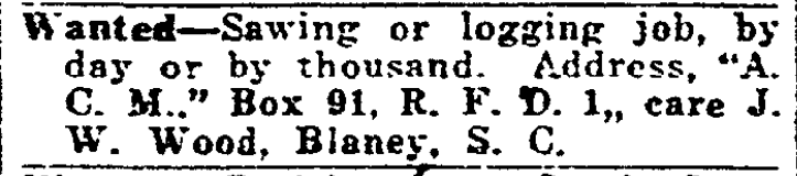 Wanted – Sawing or logging job, by day or by thousand. Address, “A. C. M.” Box 91, R. F. D. 1, care J. W. Wood, Blaney, S. C.
