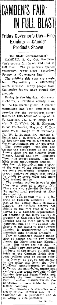 Friday is the big day. Governor Richards, a Kershaw county man, will be the special guest. A special committee has been appointed to provide for the governor’s entertainment, this being made up of H. G. Carrison, Jr., L. T. Mills, Senator G. C. Welsh, M. H. Heyman, C. W. Birchmore, Mayor C. P. DuBose, W. R. Hough, R. M. Kennedy, Jr., W. L. Depass, Sr., Mendel L. Smith and J. B. Zemp. A luncheon at Hobkirk Inn will be a feature of the entertainment for the governor.