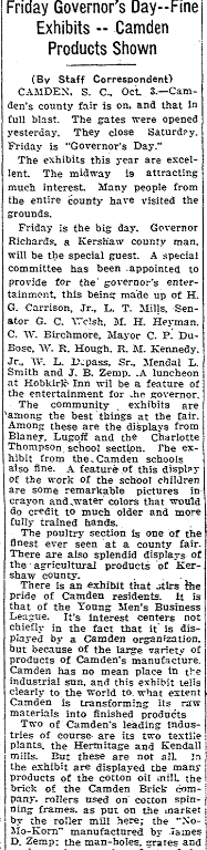 Friday is the big day. Governor Richards, a Kershaw county man, will be the special guest. A special committee has been appointed to provide for the governor’s entertainment, this being made up of H. G. Carrison, Jr., L. T. Mills, Senator G. C. Welsh, M. H. Heyman, C. W. Birchmore, Mayor C. P. DuBose, W. R. Hough, R. M. Kennedy, Jr., W. L. Depass, Sr., Mendel L. Smith and J. B. Zemp. A luncheon at Hobkirk Inn will be a feature of the entertainment for the governor.