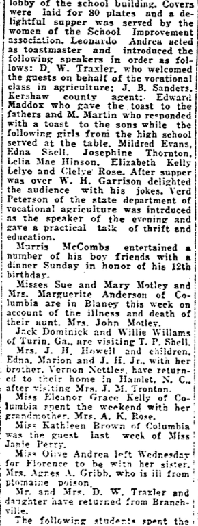 Blaney, Nov. 19. – An enjoyable father-son banquet was given by the boys of the high school and seventh grade to their father last Tuesday evening in the main lobby of the school building. Covers were laid for 80 plates and a delightful supper was served by the women of the School Improvement association. Leonardo Andrea acted as toastmaster and introduced the following speakers in order as follows: D. W. Traxler, who welcomed the guest on behalf of the vocational class in agriculture: D. W. Traxler, who welcomed the guest of behalf of the vocational class in agriculture: J. B. Sanders, Kershaw county agent: Edward Maddox who gave the toast to the fathers and M. Martin who responded with a toast to the sons while the following girls from the high school served at the table. Mildred Evans, Edna Shell, Josephine Thornton, Lelia Mae Hinson, Elizabeth Kelly Lelye and Clelye Rose. After supper was over W. H. Garrison delighted the audience with his jokes. Verd Peterson of the state department of vocational agriculture was introduced as the speaker of the evening and gave a practical talk of thrift and education.