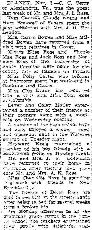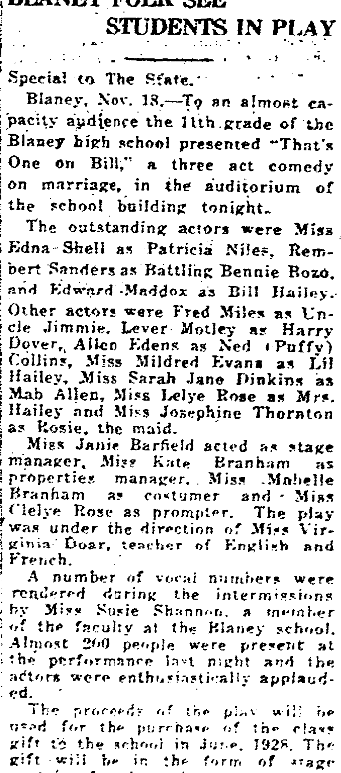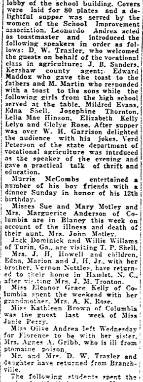 Special to The State. Blaney, Nov. 19. – An enjoyable father-son banquet was given by the boys of the high school and seventh grade to their father last Tuesday evening in the main lobby of the school building. Covers were laid for 80 plates and a delightful supper was served by the women of the School Improvement association. Leonardo Andrea acted as toastmaster and introduced … Continue reading Blaney