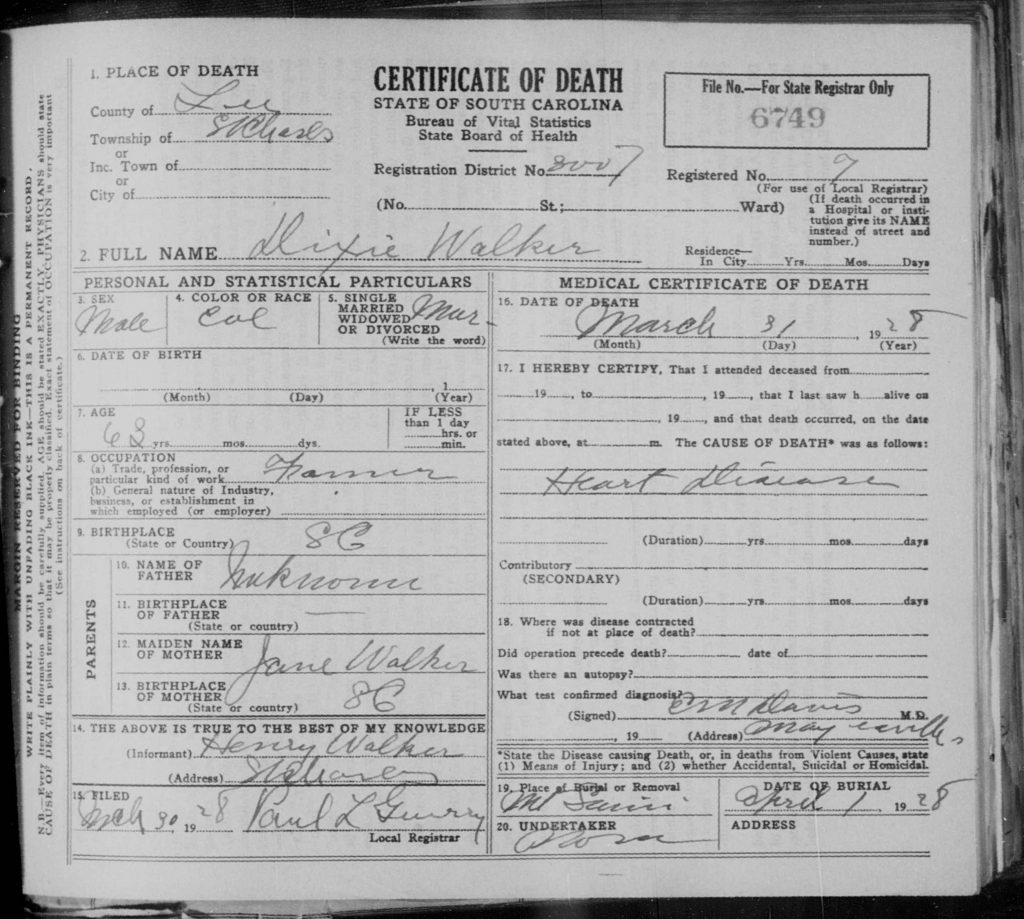 He died on 31 Mar 1928 in St Charles, Lee, South Carolina, USA. He was buried on 01 Apr 1928 in Elgin, Kershaw, South Carolina, USA at Mount Sinai AME Zion Church Cemetery. His cause of death was heart disease.