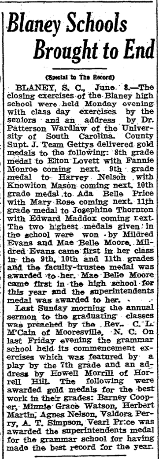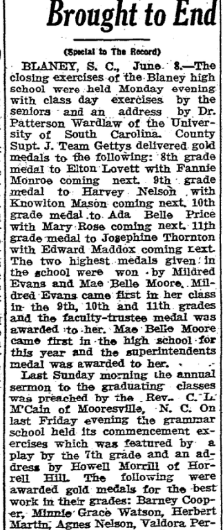 BLANEY, S. C., June 8. – The closing exercises of the Blaney high school were held Monday evening with class day exercises by the seniors and an address by Dr. Patterson Wardlaw of the University of South Carolina. County Supt. J. Team Gettys delivered gold medals to the following; 8th grade medal to Elton Lovette with Fannie Monroe coming next. 9th grade Medal to Harvey Nelson with Knowlton Mason coming next. 10th grade medal to Ada Belle Price with Mary Rose coming next. 11th grade medal to Josephine Thornton with Edward Maddox coming next. The two highest medals given in the school were won by Mildred Evans and Mae Belle Moore. Mildred Evans came first in her class in the 9th, 10th, and 11th grades and the faculty-trustee medal was awarded to her. Mae Belle Moore came first in the high school for this year and the superintendents medal was awareded to her.