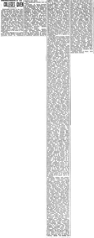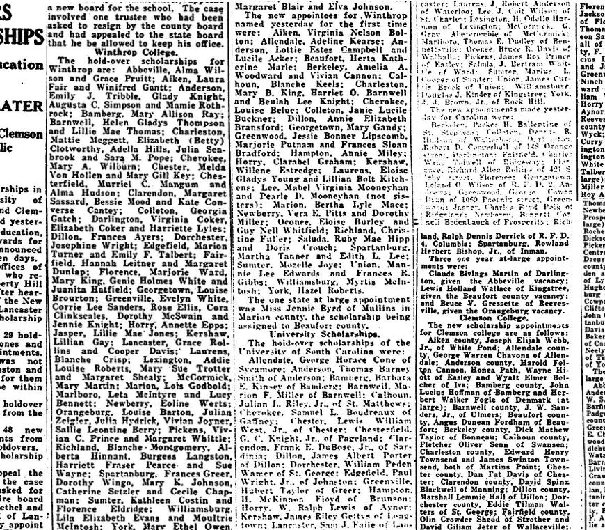 Scholarships awards to the University of South Carolina, Clemson, and Winthrop were made Tuesday by the state board of education, meeting in the office of Governor John G. Richards, chairman ex-officio; The awards included 11 new scholarships to the university, 29 holdovers, and three one year scholarships from the state at large: 40 new scholarships were awarded to Winthrop, 83 holdovers and one from the … Continue reading SCHOLARSHIPS TO COLLEGES GIVEN