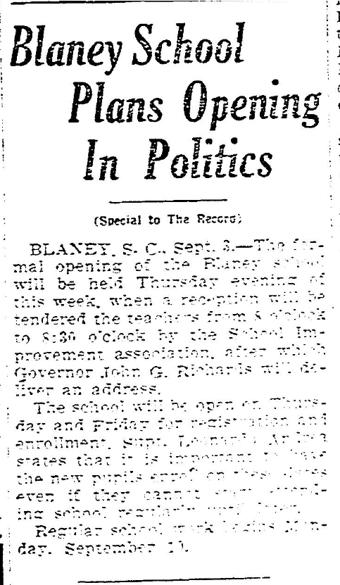 BLANEY, S. C., Sept. 3. – The formal opening of the Blaney school will be held Thursday evening of this week, when a reception will be tendered the teachers from 8 o’clock to 8:30 o’clock by the School. Improvement association, after which Governor John G. Richards will deliver an address.