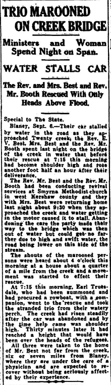 Blaney, Sept. 6 – Their car stalled by the water in the road as they approached Twenty creek, they Rev. E. V. Best, Mrs. Best and the Rev. Mr. Booth spent last night on the bridge of the creek in water that before their rescue at 7:15 this morning had become shoulder high and rose another foot half an hour after their deliverance.