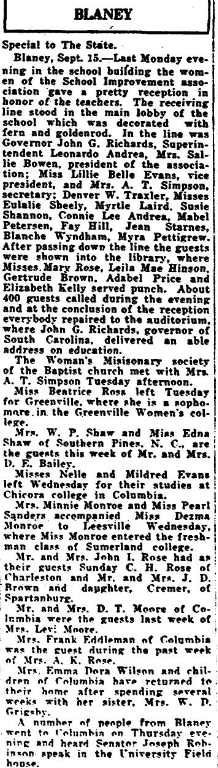 Blaney, Sept. 15. – Last Monday evening in the school building the women of the School Improvement association gave a pretty reception in honor of the teachers. The receiving line stood in the main lobby of the school which was decorated with fern and goldenrod. In the line was Governor John G. Richards, Superintendent Leonardo Andrea, Mrs. Sallie Bowen, president of the association; Miss Lille Belle Evans, vice president, and Mrs. A. T. Simpson, secretary; Denver W. Traxler, Misses Eulalie Sheely, Myrtle Laird, Susie Shannon, Connie Lee Andrea, Mabel Peterson, Fay Hill, Jean Starnes, Blanche Wyndham, Myra Pettigrew. After passing down the line the guests were show into the library, where Misses Mary Rose, Leila Mae Hinson, Gertrude Brown, Adabel Price and Elizabeth Kelly served punch. About 400 guest called during the evening and at the conclusion of the reception everybody repaired to the auditorium, where John G. Richards, governor of South Carolina, delivered an able address on education.