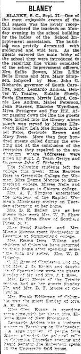BLANEY, S. C., Sept. 17 – One of the most enjoyable events of the fall season was the lovely reception tendered the teachers on Monday evening in the school building by the ladies of the School Improvement association. The building was prettily decorated with goldenrod and wild fern. As the guest entered the main lobby of the school they were introduced to the receiving line which consisted of the school improvement officers, Mrs. Sallie Bowen, Miss Lillie Belle Evans and Mrs. Mary Simpson, followed by Hon. John G. Richards, governor of South Carolina, Supt. Leonardo Andrea, Denver W. Traxler, Myrtle Laird, Connie Lee Andrea, Mabel Peterson, Jean Starnes, Blanche Wyndham, Myra Pettigrew and Fay Hill. After passing down the line the guests were invited into the library where punch was served by Misses Eliabeth Kelly, Lela Mae Hinson, Adabel Price, Gertrude Brown and Mary Rose. More than four hundred guests called during the evening and at the conclusion of the reception they repaired to the auditorium, where addresses were given by Supt J. Team Gettys and Governor John G. Richards.