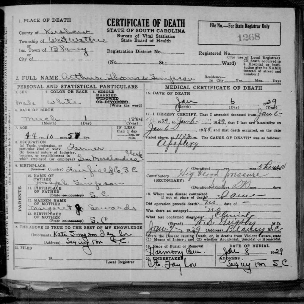 On September 12, 1918, Arthur Thomas Simpson completed his United States World War I Draft Registration Card, listing his address as R F D, Blaney, Kershaw, SC, 34-year-old, date of birth as March 1, 1884. He was a farmer. His wife, Mary Letitia Simpson, was listed as his nearest relative. He was described as medium height, medium built, gray eyes, dark hair.
