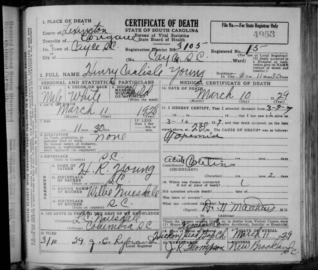 He died on 10 Mar 1929 in Cayce, Lexington, South Carolina, USA. Henry Carlyle Young was buried on 11 Mar 1929 in Westville, Kershaw, South Carolina, USA at Bethany Baptist Church Cemetery. His cause of death was topemid due to acute poletin.