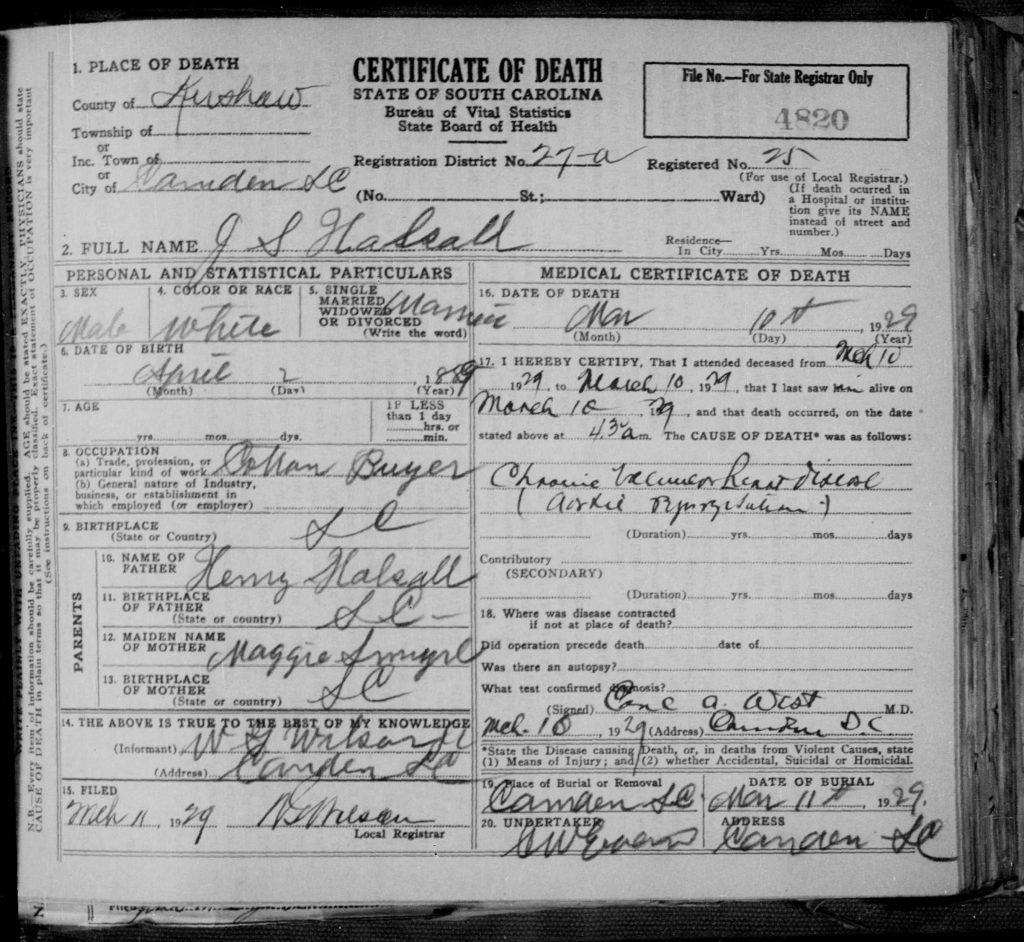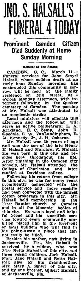 CAMDEN, S. C., March 11. – Funeral services for John Smyrl Halsall, whose sudden death at an early hour Sunday morning has enshrouded this community in sorrow, will be held at the family residence, on Mill street, at 4 o’clock Monday afternoon, with interment following in the Quaker cemetery of Camden. The passing of Mr. Halsall was attributed to apoplectic stroke.