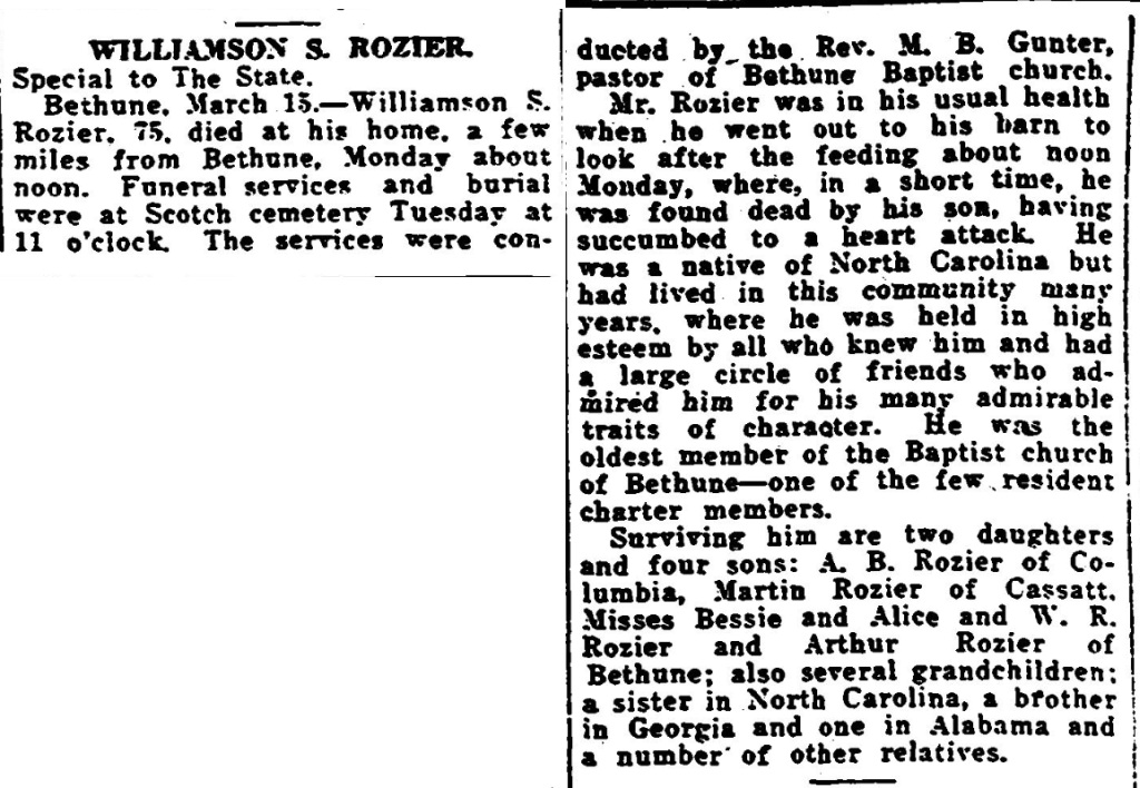 Surviving him are two daughters and four sons: A. B. Rozier of Columbia, Martin Rozier of Cassatt and Misses Bessie and Alice and W. R. Rozier and Arthur Rozier of Bethune; also several grandchildren: a sister in North Carolina, a brother in Georgia and one in Alabama and a number of other relatives.