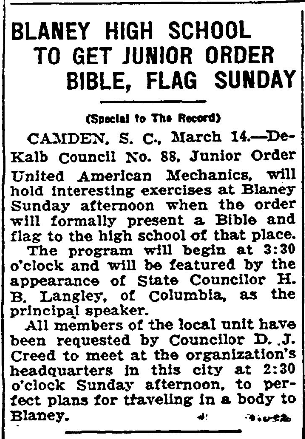 CAMDEN, S. C., March 14. – De Kalb Council No. 88, Junior Order United American Mechanics, will hold interesting exercises at Blaney Sunday afternoon when the order will formally present a Bible and flag to the high school of that place.