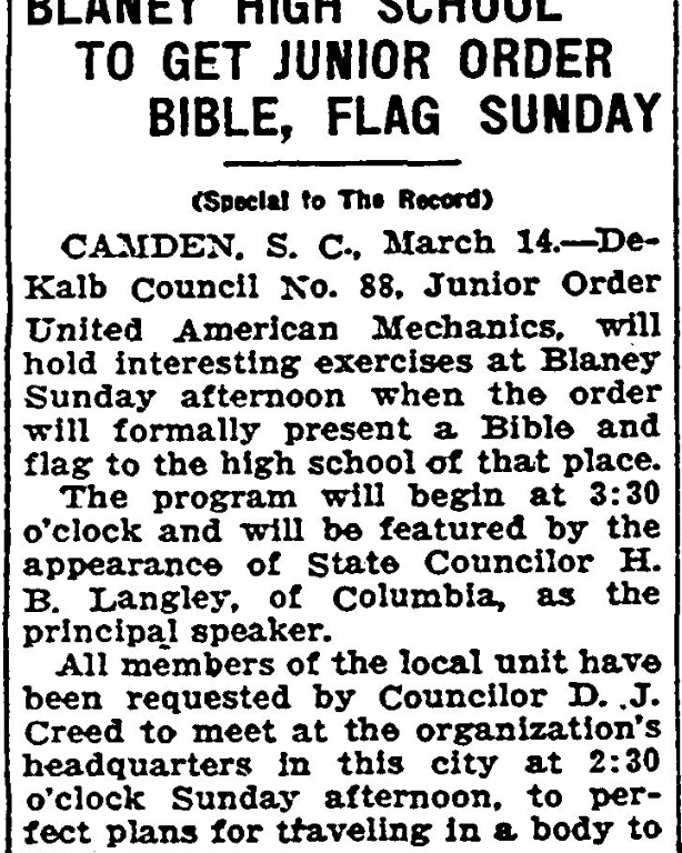 CAMDEN, S. C., March 14. – De Kalb Council No. 88, Junior Order United American Mechanics, will hold interesting exercises at Blaney Sunday afternoon when the order will formally present a Bible and flag to the high school of that place.