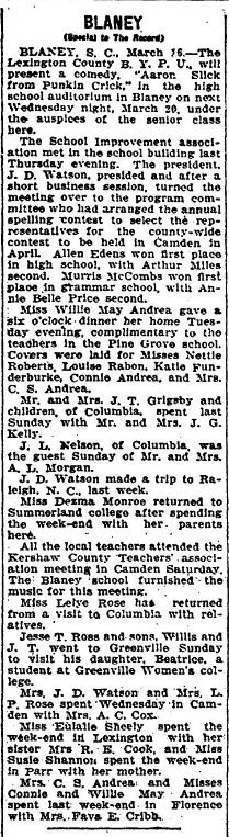 All the local teachers attended the Kershaw County Teachers’ association meeting in Camden Saturday, The Blaney school furnished the music for this meeting.