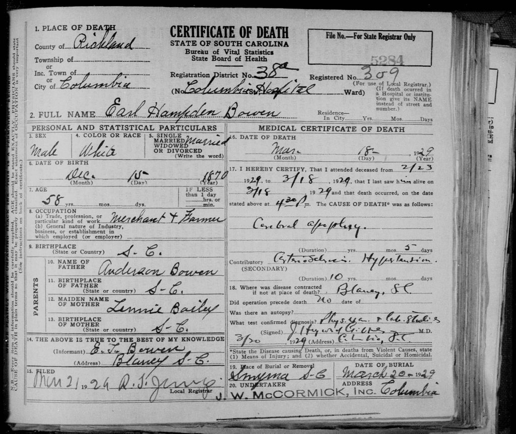 Earl Hampden Bowen, 58, died on March 18, 1929. He was buried at Smyrna United Methodist Church Cemetery in Elgin, Kershaw County, South Carolina.