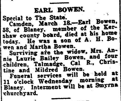 Camden, March 18. – Earl Bowen, 58, of Blaney, member of the Kershaw county board, died at his home today. He was a son of A. H. Bowen and Martha Bowen.