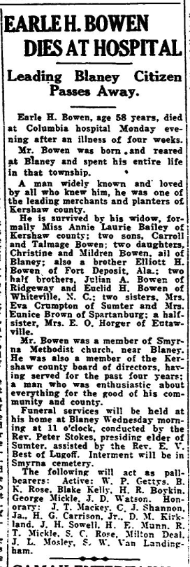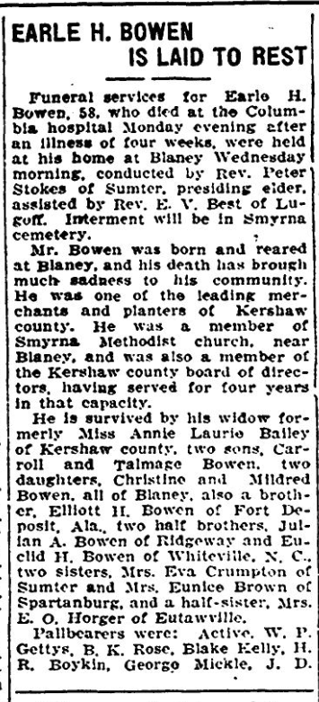 He is survived by his widow formerly Miss Annie Laurie Bailey of Kershaw county, two sons, Carroll and Talmage Bowen, two daughters, Christine and Mildred Bowen, all of Blaney, also a brother, Elliott H. Bowen of Fort Deposit, Ala., two half brothers, Julian A. Bowen of Whiteville, N. C., two sister, Mrs. Eva Crumpton of Sumter and Mrs. Eunice Brown of Spartanburg, and a half-sister, Mrs. E. O. Horger of Eutawville.