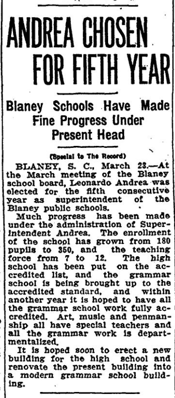 BLANEY, S. C., March 23 – At the March meeting of the Blaney school board, Leonardo Andrea was elected for the fifth consecutive year as superintendent of the Blaney public schools.