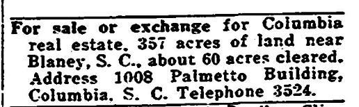 For sale or exchange for Columbia real estate. 357 acres of land near Blaney, S. C., about 60 acres cleared. Address 1008 Palmetto Building, Columbia, S. C. Telephone 3524.