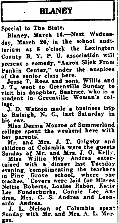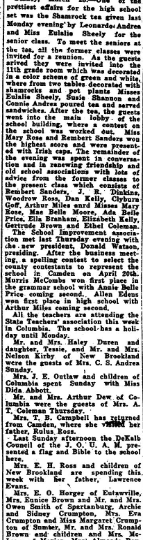 Special to The State. Blaney, March 23. – One of the prettiest affairs for the high school set was the Shamrock tea given last Monday evening by Leonardo Andrea and Miss Eulalie Sheely for the senior class. To meet the seniors at the tea, all the former classes were invited for a reunion. As the guests arrived they were invited into the 11th grade room … Continue reading BLANEY