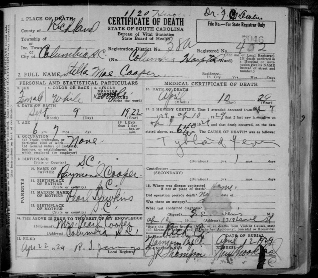 Stella Mae Cooper passed away on April 10, 1929 of Typhoid fever in the Columbia Hospital. She was buried on April 12, 1929 in Harmon Baptist Cemetery.