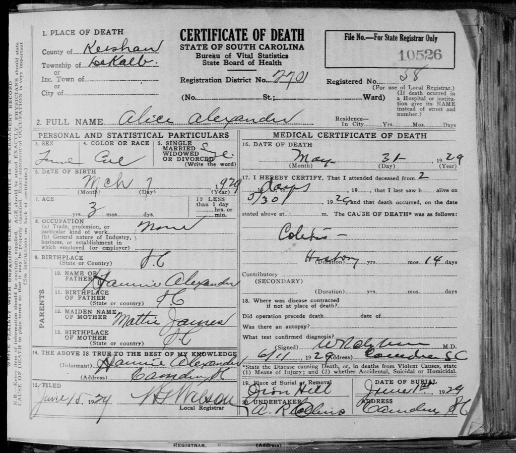 She died on 31 May 1929 in De Kalb, Kershaw, South Carolina, USA. Alice Alexander was buried on 01 Jun 1929 in Kershaw, South Carolina, USA at Zion Hill AME Zion Church Cemetery. Her cause of death was colic.