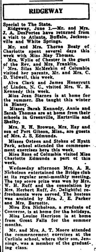 Ridgeway, June 1. – Mr. and Mrs. J. A. DesPortes have returned from a visit to Atlanta, Buffalo, Jacksonville and White Springs.