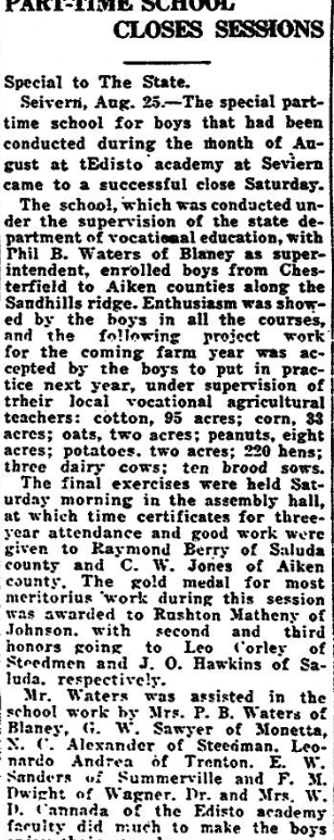 Special to The State. Seivern, Aug. 25. – The special part-time school for boys that had been conducted during the month of August at Edisto academy at Seviern came to a successful close Saturday. The school, which was conducted under the supervision of the state department of vocation education, with Phil B. Waters of Blaney as superintendent, enrolled boys from Chesterfield to Aiken counties along … Continue reading PART-TIME SCHOOL CLOSES SESSIONS