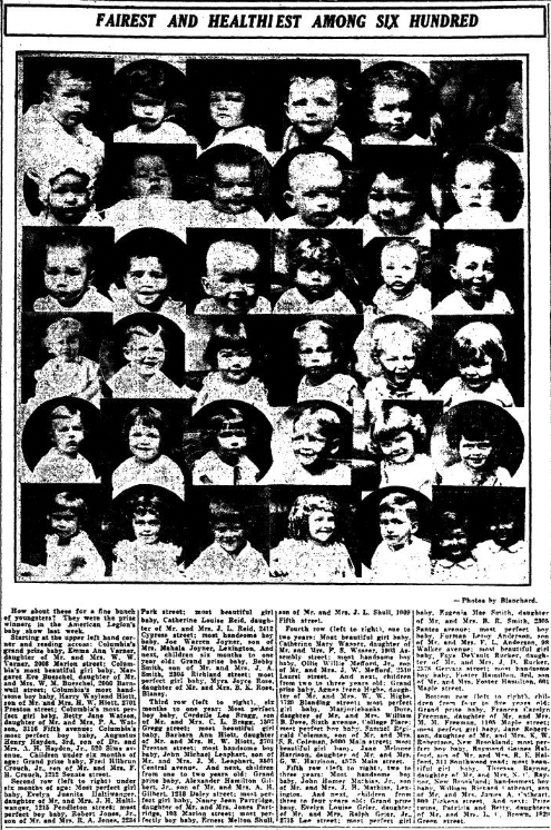 Third row (left to right), six months to one year: Most perfect boy baby, Cordelle Lee Bragg, son of Mr. and Mrs. C. L. Bragg, 1507 Gregg street; most beautiful girl baby, Barbara Ann Hiott, daughter of Mr. and Mrs.H. W. Hiott, 2701 Preston street; most handsome boy baby, John Michael Leaphart, 3501 Central avenue. And next, children from one to two years old: Grand prize baby, Alexander Hamilton Gilbert, Jr. , son of Mr. and Mrs. A. H. Gilbert 1218 Daley street; most perfect girl baby, Nancy Jean Partridge, daughter of Mr. and Mrs.Jones Partridge, 103 Marion street; most perfectly boy baby, Ernest Melton Shull, son of Mr. and Mrs. J. L. Shull, 1009 Fifth street.