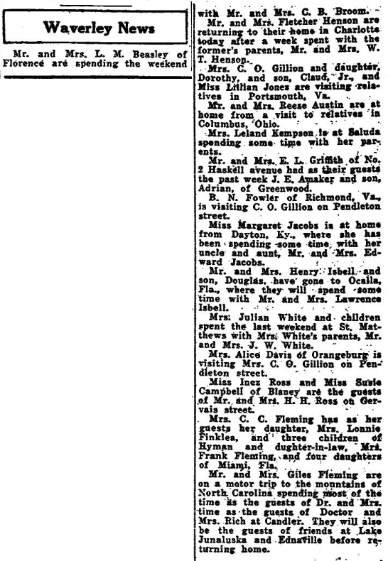 Mrs. Julian White and children spent the last weekend at St. Matthews with Mrs. White’s parents, Mr. and Mrs. J. W. White.