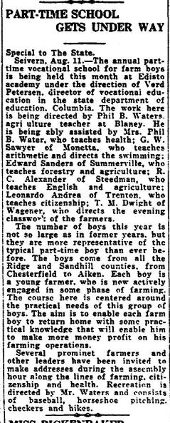 Seivern, Aug. 11.- The annual part-time vocational school for farm boys is being held this month at Edisto academy under the direction of Verd Petersen, director of vocational education in the state department of education. Columbia. The work here is being directed by Phil B. Waters, agriculture teacher at Blaney. He is being ably assisted by Mrs. Phil B. Waters, who teaches health; G. W. Sawyer of Monetta, who teaches arithmetic and directs the swimming: Edward Sanders of Summerville, who teaches forestry and agriculture; R. C. Alexander of Steedman, who teaches English and agriculture; Leonardo Andrea of Trenton, who teaches citizenship: T. M. Dwight of Wagener, who directs the evening classwork of the farmers.