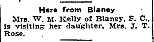 Today in HistoryPersonals Here from Blaney Mrs. W. M. Kelly of Blaney, S. C., is visiting her daughter, Mrs. J. T. Rose. August 18, 1929 Columbia Record (published as The Sunday Record) Columbia, South CarolinaPage 15
