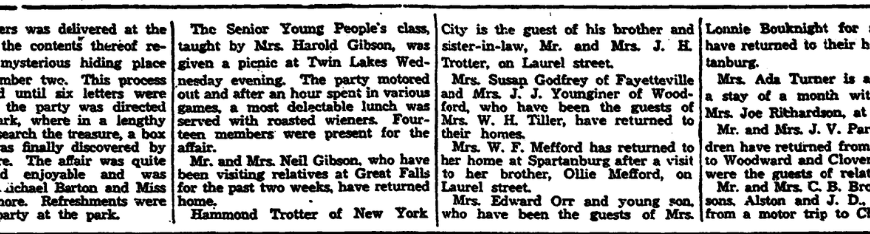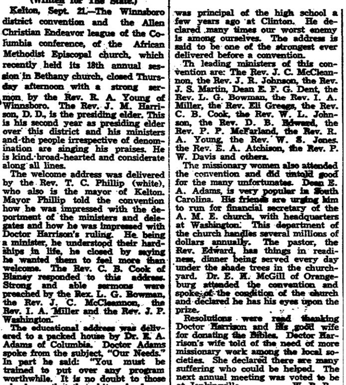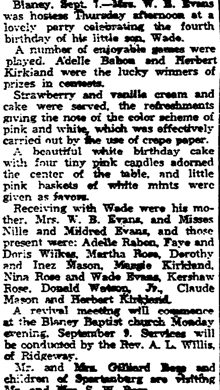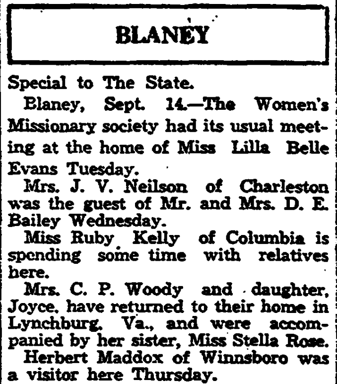 Special to The State. Blaney, September 21. – The following students left this week to resume their school work. Miss Beatrice Ross, Greenville Women’s college, Misses Nelle and Mildred Evans, Chicora; Harry Ross, Charleston Medical, and Edward Maddox, Clemson. Norman accompanied by Mr. and Mrs. J. O. Eddleman to China Grove, North Carolina, Saturday, where they were called to the bedside of their father. Misses … Continue reading Blaney