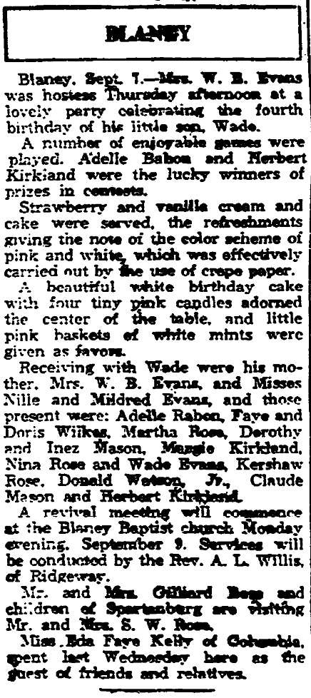 Blaney, September 7. – Mrs. W. B. Evans was hostess Thursday afternoon at a lovely party celebrating the fourth birthday of his little son, Wade.