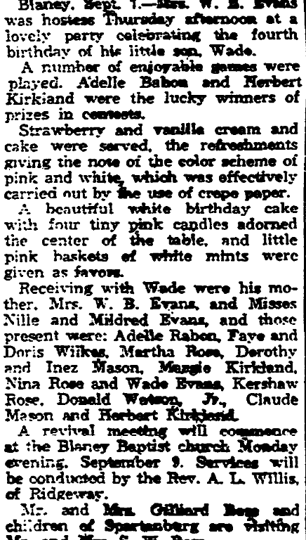 Receiving with Wade were his mother, Mrs. W. B. Evans, and Misses Nille Evans and Mildred Evans, and those present were: Adelle Rabon, Faye Wilkes and Doris Wilkes, Martha Rose, Dorothy Mason and Inez Mason, Margie Kirkland, Nina Rose and Wade Evans, Kershaw Rose, Donald Watson, Jr., Claude Mason and Herbert Kirkland.