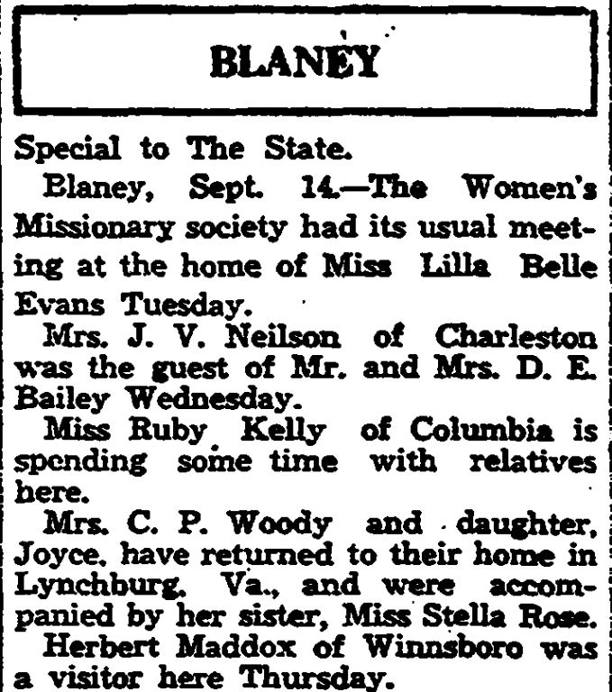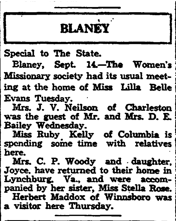 Blaney, September 14. – The Women’s Missionary society had its usual meeting at the home of Miss Lilla Belle Evans Tuesday.