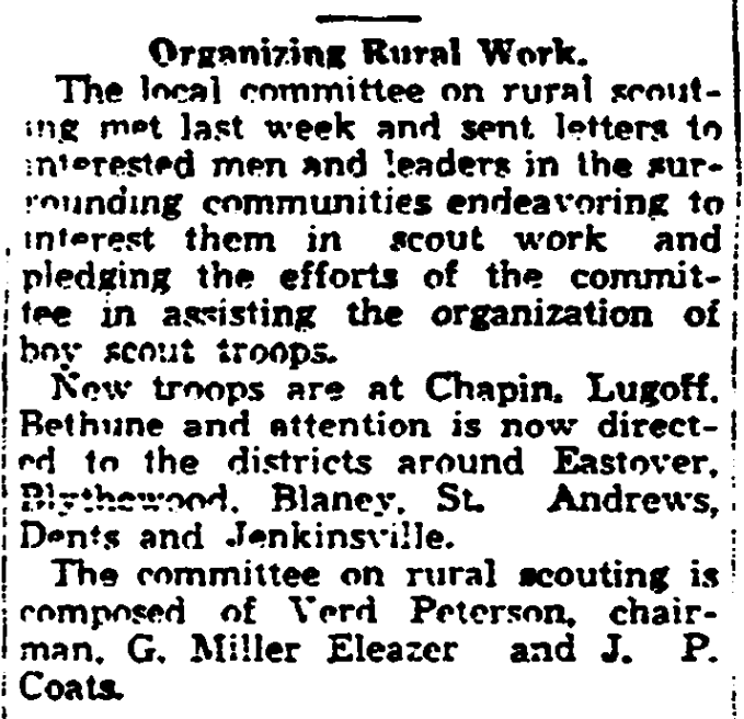 The local committee on rural scouting met last week and sent letters to interested men and leaders in the surrounding communities endeavoring to interest them in scout work and pledging the efforts of the committee in assisting the organization of boy scout troops.