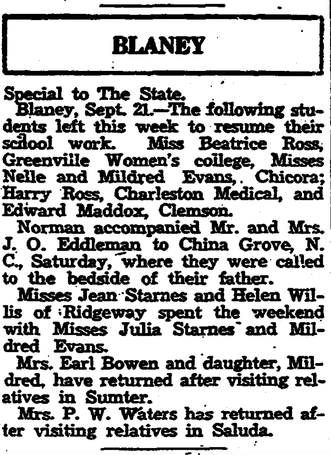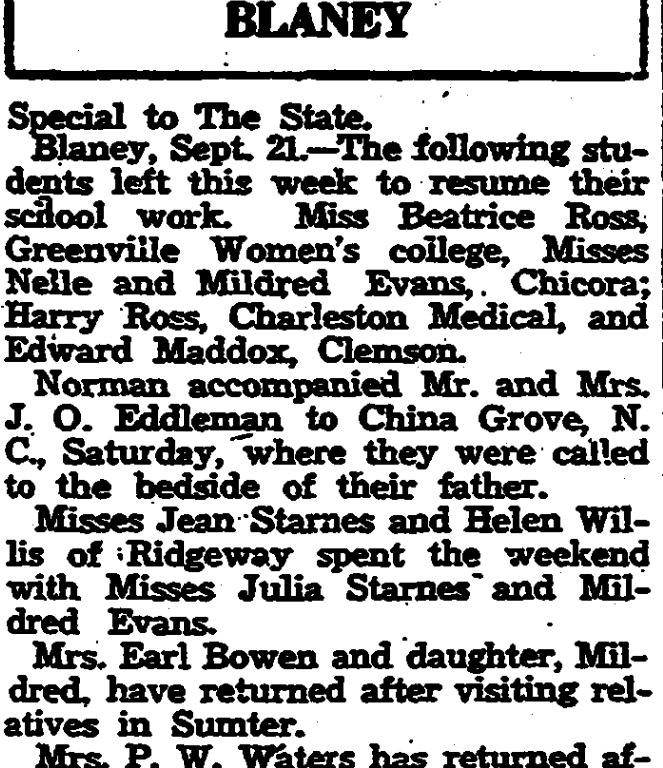 Blaney, September 21. – The following students left this week to resume their school work. Miss Beatrice Ross, Greenville Women’s college, Misses Nelle and Mildred Evans, Chicora; Harry Ross, Charleston Medical, and Edward Maddox, Clemson.