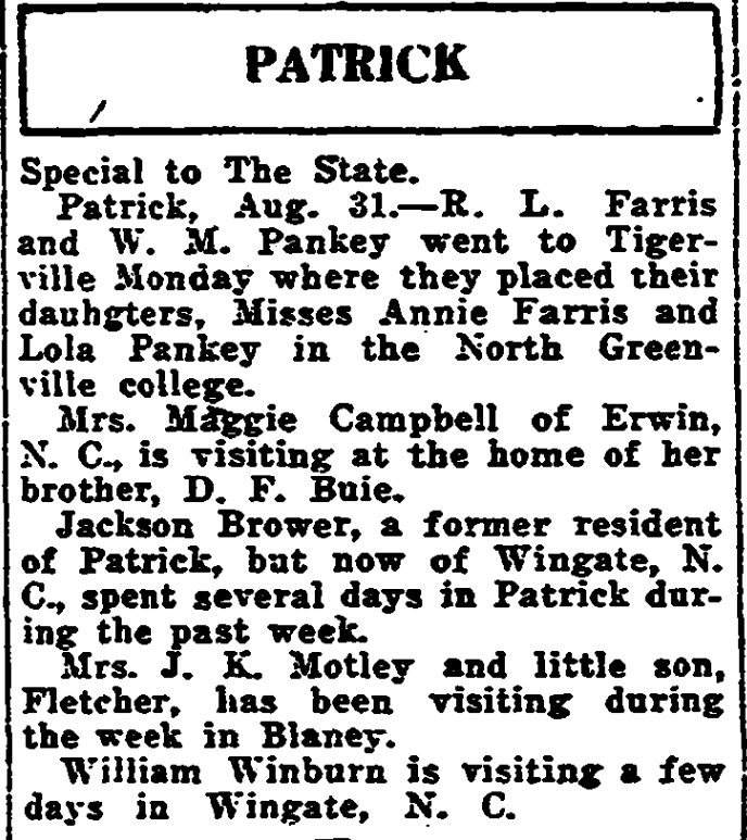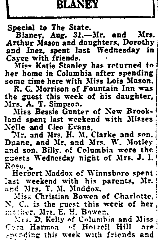 Special to The State. Blaney, August 31. – Mr. and Mrs. Arthur Mason and daughters, Dorothy and Inez, spent last Wednesday in Cayce with friends. Miss Katie Stanley has returned to her home in Columbia after spending some time here with Miss Lois Mason. R. C. Morrison of Fountain Inn was the guest this week of his daughter, Mrs. A. T. Simpson. Miss Bessie Gunter … Continue reading Blaney